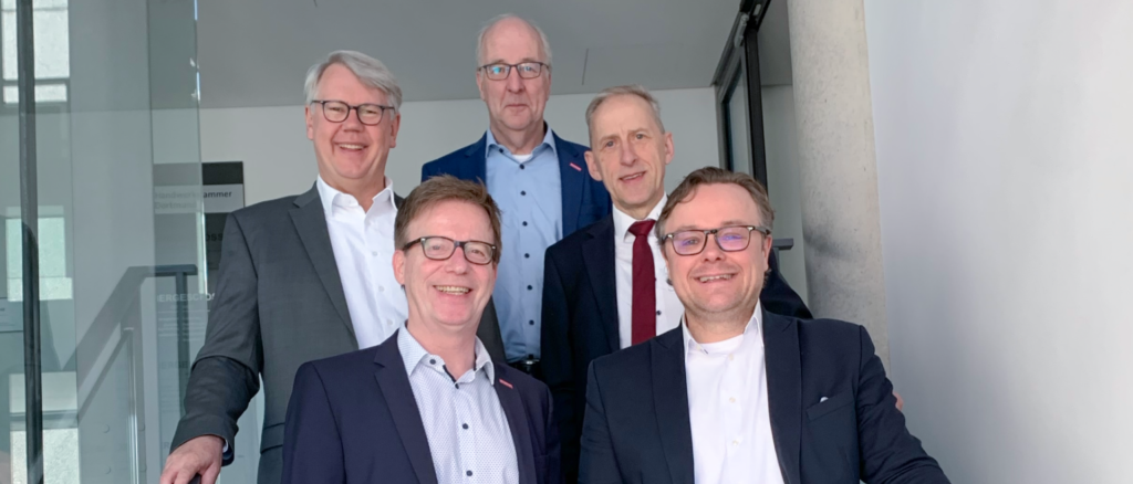Kammerbezirk. Anfang Mai kamen die drei Hauptgeschäftsführer der Ruhrgebiets-Kammern Carsten Harder (Dortmund), Dr. Axel Fuhrmann (Düsseldorf) und Thomas Banasiewicz (Münster) sowie der stellvertretende Hauptgeschäftsführer der HWK Münster, Thomas Harten, in Dortmund zusammen, um sich mit dem neuen Geschäftsführer der BMR, Jörg Kemna, über die Belange des Handwerks in der Region auszutauschen.