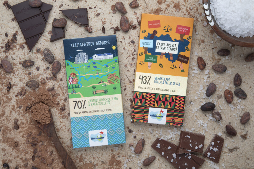 Die Schokoladen werden in Ghana zu 100 Prozent klimaneutral mit Ökostrom produziert. Auch der Transport der Schokolade nach Europa erfolgt möglichst klimaschonend mit dem Schiff. Der Kakao stammt von Bauern einer ghanaischen Bio-Kakao-Kooperative. 43 Prozent des Gewinns bleiben im Herkunftsland, bei einer herkömmlichen Tafel Schokolade sind es nur etwa 13 Prozent. „Das Netzwerk der Fairen Metropole Ruhr ist ein weiteres Beispiel, wie im Ruhrgebiet über Stadtgrenzen hinweg zusammengearbeitet wird. Die fair gehandelte Schokolade ist neben dem Pottkaffe ein weiteres leckeres, nachhaltiges Ergebnis dieser Kooperation“, so Markus Schlüter, stellvertretender RVR-Regionaldirektor.