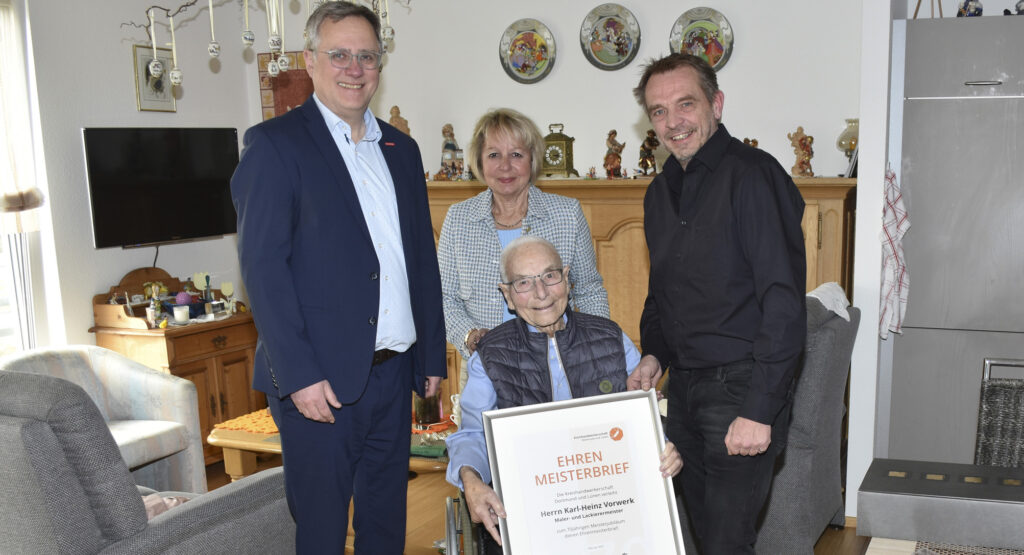 Es ist ein seltenes Jubiläum: Der Dortmunder Karl-Heinz Vorwerk konnte jetzt auf die 70-jährige Wiederkehr seiner Meisterprüfung im Maler- und Lackiererhandwerk zurückblicken. Matthias Behr, Obermeister der Maler- und Lackierer-Innung Dortmund und Lünen und Innungs-Geschäftsführer Joachim Susewind besuchten aus diesem Anlass den 93-Jährigen am Montag (17. April) in seiner Wohnung im Sonnenhof in Dortmund-Eving. Neben den Glückwünschen aller Innungsbetriebe überbrachten sie dabei auch eine Ehrenurkunde und ein Präsent des Handwerks. „Unser Gewerk braucht herausragende Vorbilder wie Sie”, lobte Obermeister Matthias Behr in seiner Laudatio. „Ihr Lebensweg zeigt uns allen, wie erfolgreich eine Karriere im Handwerk sein kann und dass man mit seinem Beruf bis ins hohe Alter hinein glücklich sein kann.”