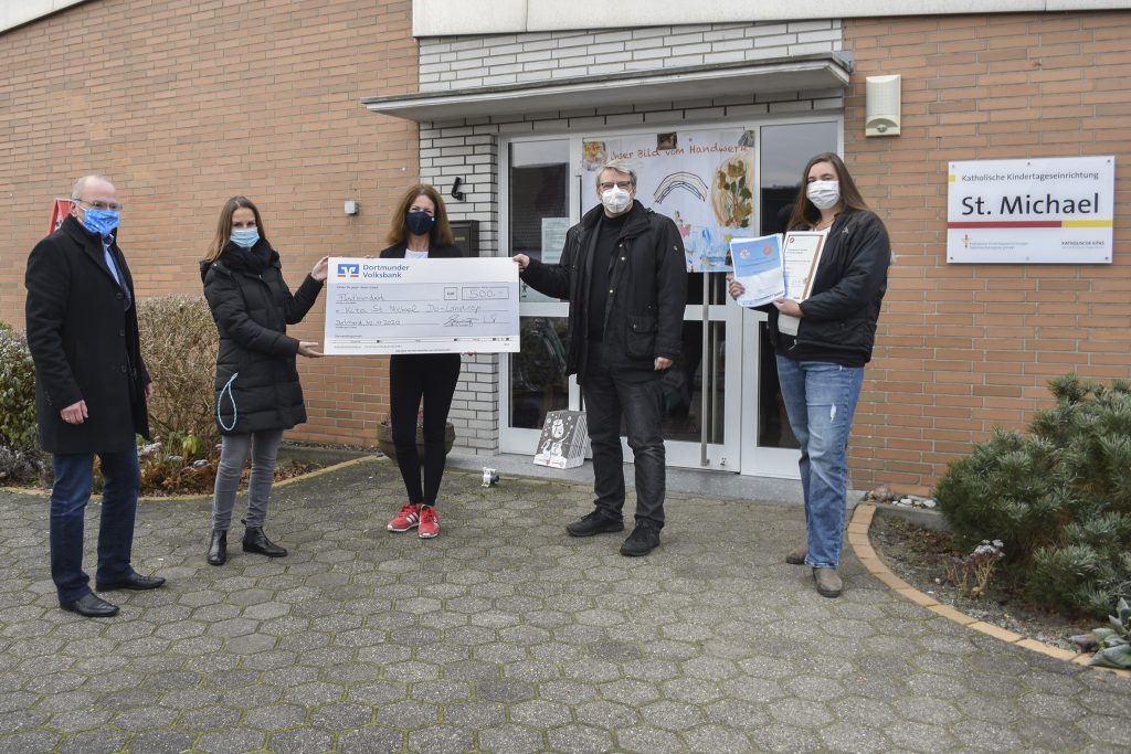 Kein Fest mit jubelnden Kindern, dafür aber gleich dreimal jubelnde Erzieherinnen gab es in diesem Jahr beim Wettbewerb „Unser Bild vom Handwerk“ der Kreishandwerkerschaft Dortmund und Lünen. Statt wie üblich die Sieger-Kinder zum Besuch der Werkstätten des Handwerks in Dortmund-Körne einzuladen, kamen die Vertreter der Kreishandwerkerschaft und der Sponsoren diesmal unter Corona-Bedingungen direkt zu den Kitas. Den ersten Platz sicherte sich diesmal der Kindergarten St. Michael in Dortmund-Lanstrop. Leiterin Nadja Domke und Erzieherin Simone Hein nahmen im Namen der Kinder den Siegerscheck über 500 Euro aus den Händen von Kreishandwerksmeister Christian Sprenger entgegen. Das Geld soll für eine Matschanlage auf dem Außengelände verwendet werden. 13 Kinder im Alter zwischen 5 und 6 Jahren hatten das Siegerbild erstellt und eingereicht.
