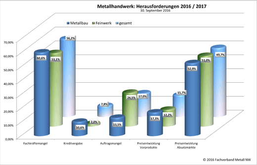 Die wirtschaftliche Gesamtlage des Metallhandwerks in Nordrhein-Westfalen präsentiert sich zum Ende des dritten Quartals 2016 nahezu unverändert. Die durchschnittliche Bewertung der aktuellen wirtschaftlichen Lage liegt auf einer Schulnotenskala im Metallbau bei 2,47 und damit um 0,1 Punkte besser und in den feinwerkmechanischen Unternehmen unverändert bei 2,78. Über zumindest stabile Aussichten freuen sich im Schnitt des Metallhandwerks annähernd acht von zehn Unternehmen.