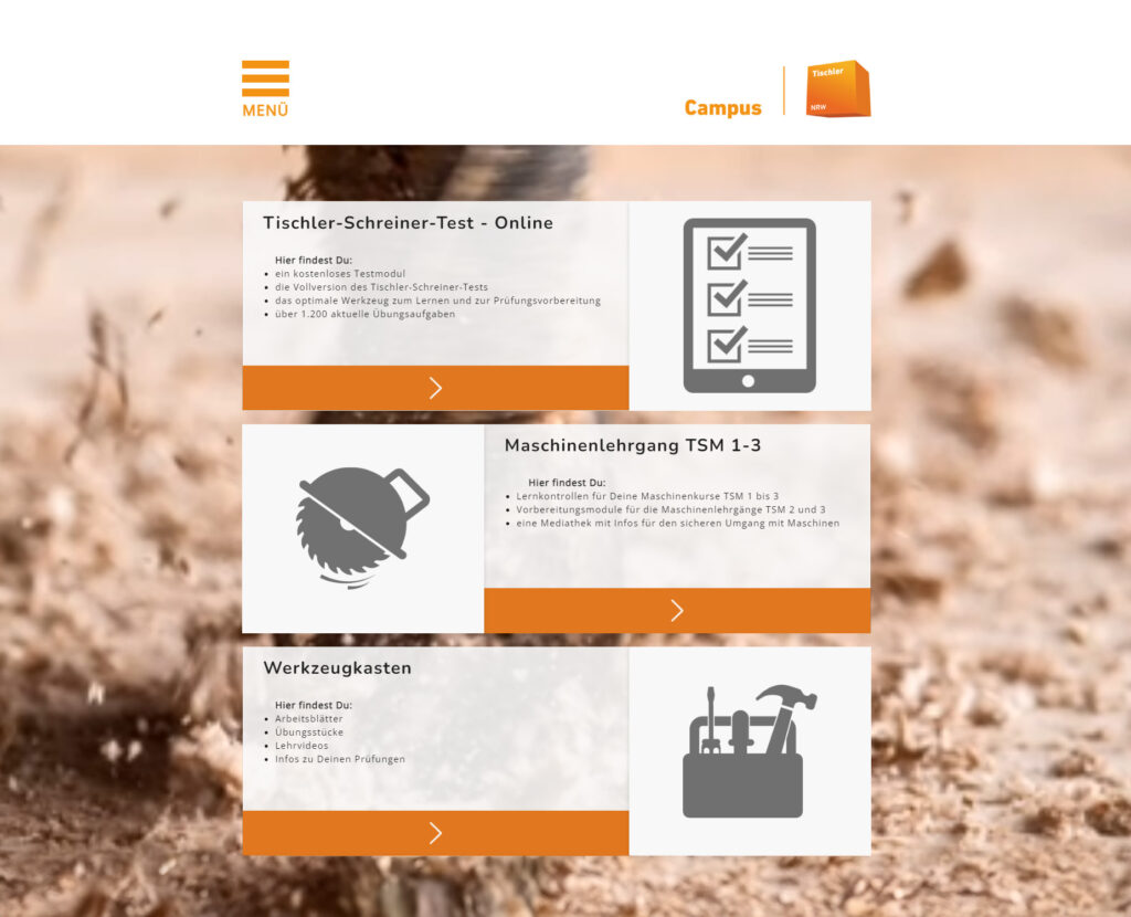 Neben dem kostenpflichtigen Tischler-Schreiner-Test bietet der Campus zahlreiche kostenfreie Lerninhalte: So können die Auszubildenden beispielsweise die Tischler-Schreiner-Maschinenlehrgänge (TSM 1 bis 3) in den überbetrieblichen Lehrwerkstätten vor- und nachbereiten. Hierfür stehen Lerninhalte zur Verfügung die zusammen mit der Berufsgenossenschaft Holz und Metall (BGHM) entwickelt wurden.