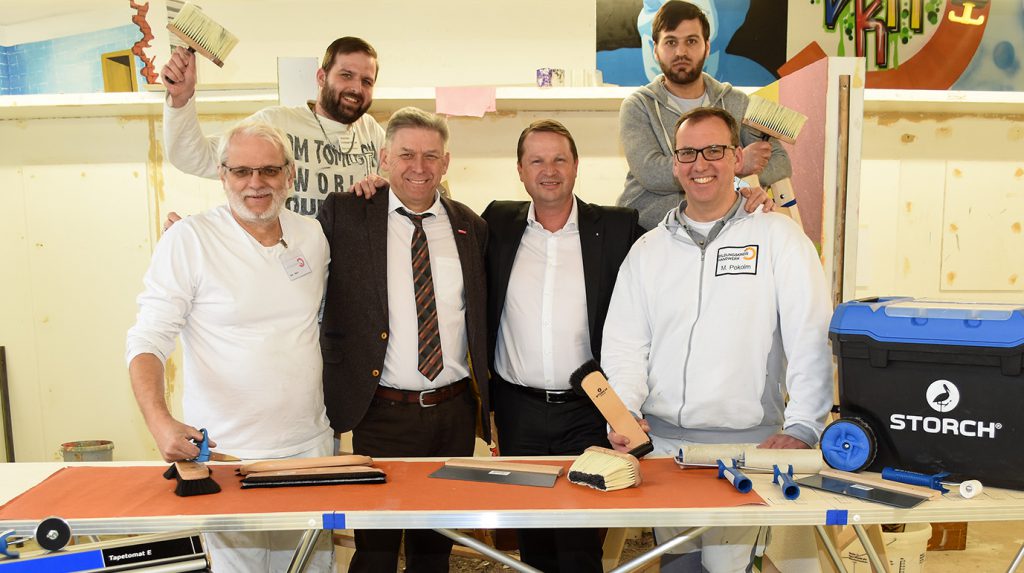 Nach dem Weltrekord kommt der Dauereinsatz: Tapeziertische, Leitern, Werkzeug-Trolleys, ein Tapetenkleistergerät und Kleinwerkzeuge, die im Januar beim Weltrekord im Tapezieren benutzt worden waren, haben jetzt ihren Weg in die Malerwerkstatt des Bildungskreises Handwerk gefunden. Großzügiger Spender ist die Wuppertaler STORCH Malerwerkzeuge & Profigeräte GmbH. Sie hatte mit dem Material den Weltrekord im Dauertapezieren unterstützt, den der Verband der Deutschen Tapetenindustrie e.V. (VDT) im Januar in Zusammenarbeit mit der Messe „Heimtextil“ in Frankfurt initiiert hatte. Auf einer riesigen Wandfläche hatten seinerzeit Teams – vom Meister bis zum Lehrling – 96 Stunden lang Tapetenmuster geklebt und damit den Weg an die Weltspitze geschafft. Auch Prominente wie TV-Moderatorin Resi Colte (Sendung „Die Maus”), die amtierende “Miss-DIY” Kerstin Weiser und Star-Designer Guido Maria Kretschmer hatten die einzigartige Aktion unterstützt.