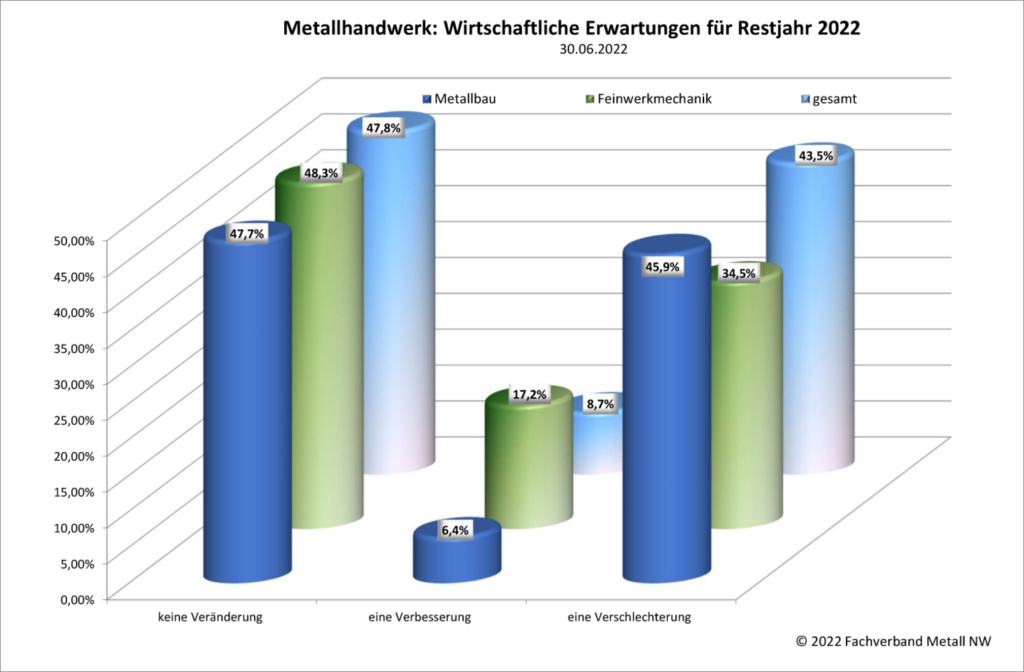 „Das nordrhein-westfälische Metallhandwerk steht vor großen Herausforderungen. Zum einen steigen die Preise in einem ungewöhnlichen Ausmaß und zum anderen steigt die Wettbewerbsintensität, gemessen an fehlenden Aufträgen und daraus resultierendem Preiswettbewerb, stark an. Verschärfend wirken der Fachkräftemangel und die temporär existierenden Probleme in den Lieferketten. Zudem sind jetzt durch die Politik geschürte Erwartungen an Einmalzahlungen kontraproduktiv. Diese führen im personalintensiven Metallhandwerk zu überdurchschnittlichen, zusätzlichen Kostenbelastungen, die die Situation in den Betrieben weiter verschärfte“, kommentiert Stephan Lohmann, Geschäftsführer des Fachverbandes Metall NW die aktuellen Ergebnisse.