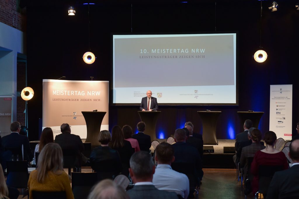 Rund einhundert Gäste begrüßten Wirtschaftsminister Andreas Pinkwart und Berthold Schröder, Präsident der Handwerkskammer Dortmund, am 08.10.2021 im HWK Bildungszentrum Hansemann in Dortmund. Bereits zum zehnten Mal lud der Westdeutsche Handwerkskammertag (WHKT) als Dachverband der sieben NRW-Handwerkskammern gemeinsam mit dem Ministerium für Wirtschaft, Innovation, Digitalisierung und Energie des Landes Nordrhein-Westfalen junge Handwerksmeisterinnen und -meister zur feierlichen Übergabe der Meistergründungsprämie ein. Im Zentrum der Veranstaltung standen junge Handwerksmeisterinnen und Handwerksmeister, die sich mit einer Betriebsgründung oder -übernahme auf den Weg in die Selbstständigkeit machen.