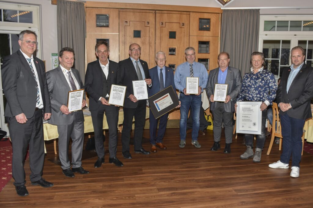 So viele verdiente Auszeichnungen auf einmal sind eine Seltenheit: Bei ihrer Frühjahrsmitgliederversammlung hat die Innung für Sanitär-, Heizungs- und Klimatechnik Dortmund und Lünen am Donnerstag insgesamt vier Goldene Ehrennadeln, eine Silberne Ehrennadel und eine Bronzene Ehrennadel vergeben. Die Innung ehrte damit Innungsmitglieder, die sich in besonderer Weise durch langjährige ehrenamtliche Tätigkeiten sowie eine langjährige Mitgliedschaft in der Innung verdient gemacht haben. Goldene Ehrennadeln erhielten die Mitglieder Jürgen Krause, Karl-Hermann Richter, Ralf Marx und Holger Michaelis. Mit der Silbernen Ehrennadel wurde Gerd Lewandowske und mit der Bronzenen Ehrennadel Herbert Krause ausgezeichnet. Gleichzeitig überreichten Obermeister Ralf Marx und Geschäftsführer Joachim Susewind nachträglich einen Silbernen Meisterbrief für 25 Jahre erfolgreiche Meisterschaft im Handwerk an den Dortmunder Christof Gurok, dessen Jubiläum im vergangenen Jahr pandemie-bedingt nicht gefeiert werden konnte.