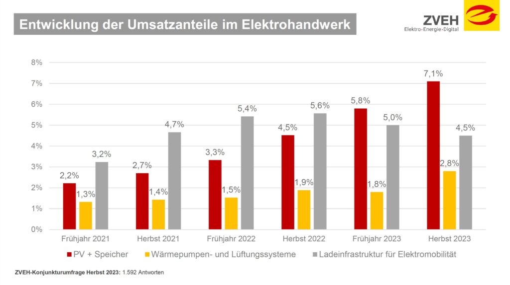 Frankfurt am Main, 18.10.2023: Für immer mehr Innungsbetriebe ist die Installation von Photovoltaik (PV), Speichern und Wärmpumpen ein attraktives Geschäftsfeld. Das verdeutlicht die zwischen dem 13. und 27. September durchgeführte Herbstkonjunkturumfrage des Zentralverbandes der Deutschen Elektro- und Informationstechnischen Handwerke (ZVEH), in deren Rahmen die mehr als 1.500 Umfrage-Teilnehmer/-innen erneut Zusatzfragen rund ums Thema „Zukunftstechnologien“ beantworteten.