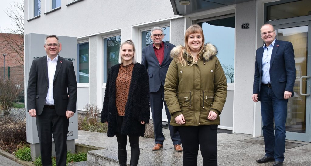 Ihren ersten Tag in der Verwaltung des Handwerks an der Langen Reihe in Dortmund-Körne hatten jetzt Michelle Weßing und Debbie Hoseit. Die beiden Auszubildenden zur Kauffrau für Büromanagement starteten am 1. Februar in ihre dreijährige Lehre. Herzlich begrüßt wurden sie dazu von Hauptgeschäftsführer Joachim Susewind, dem stellvertretenden Hauptgeschäftsführer Ludgerus Niklas und Volker Walters, der nicht nur Geschäftsführer der Kreishandwerkerschaft Dortmund und Lünen, sondern auch Geschäftsführer des Bildungskreises Handwerk e.V. (BKH) ist. Die 24-jährige Michelle Weßing, die aus Lünen kommt, und ihre ebenfalls 24 Jahre alte Mitstarterin Debbie Hoseit aus Dortmund beginnen beide ihre Ausbildung beim BKH und bringen für ihre berufliche Karriere bereits die Fachhochschulreife mit. „Wir freuen uns, dass Sie sich für eine Ausbildung bei uns entschieden haben”, begrüßte Hauptgeschäftsführer Joachim Susewind die beiden Auszubildenden. „Sie werden sehen, wie vielfältig und stark das Handwerk in unserer Region ist.“ Gleich zu Beginn stand für die beiden angehenden Kauffrauen ein Rundgang über das Gelände und durch die 11 Ausbildungswerkstätten des Handwerks in Dortmund-Körne auf dem Programm. Die Kreishandwerkerschaft Dortmund und Lünen und der Bildungskreis Handwerk eV bilden regelmäßig Kaufleute für Büromanagement aus.