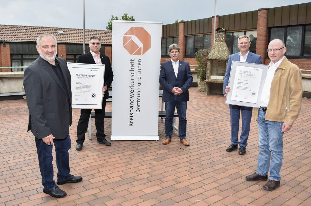 Gleich zwei Mitgliedern konnte die Innung für Elektrotechnik Dortmund und Lünen den Silbernen Meisterbrief der Handwerkskammer Dortmund übergeben. Innungsmitglied Gerd Schnurbusch (Schnurbusch Elektrotechnik Dortmund) und Vorstandsmitglied Uwe Westphal (Heinrich Arndt Licht-Kraft-Anlagen, Telefonbau GmbH & Co. KG) erhielten im Rahmen der Mitgliederversammlung aus den Händen von Obermeister Volker Conradi, dem stv. Obermeister Ralf Beyer und Geschäftsführer Ass. Joachim Susewind die Urkunden zum Jubiläum. Darüber hinaus gab es Glückwünsche für Uwe Westphal zum 75-jährigen Bestehen seines Betriebes. Obermeister Volker Conradi bedankte sich bei beiden Jubilaren für die langjährige gute Zusammenarbeit und gratulierte herzlich.