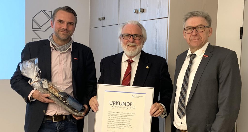 Im Rahmen ihrer Mitgliederversammlung am 11. April hat die Zweiradmechaniker-Innung Dortmund und Lünen Klaus Gerhardy zum neuen Obermeister gewählt und gleichzeitig den scheidenden Obermeister Hans Jürgen Weinrich zum Ehrenobermeister ernannt. Seit 1996 hatte Weinrich die Innung geführt und maßgeblich zu ihrem Erfolg beigetragen. „Wir danken Hans Jürgen Weinrich ganz herzlich für sein langjähriges entschlossenes Engagement. Er hat unsere Innung nicht nur geleitet, sondern auch maßgeblich geprägt. Wir freuen uns, dass er uns als Ehrenobermeister weiterhin mit Rat und Tat zur Seite stehen wird. Seine Erfahrung und sein Know-how sind von großem Wert für uns“, so der neue Obermeister Klaus Gerhardy.